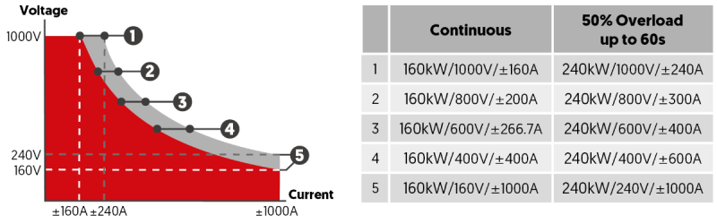 For example, a system with 160kW nominal power is capable of sourcing/sinking 240kW for up to 60 seconds. The autoranging output of a 160kW/1000V/±1000A system operating at 100% and 150% of its nominal power is shown below.