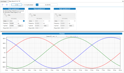 The module's active neutral string allows for any single phase or asymmetric condition to be accurately simulated. All three of the unit's phases are individually programmable for voltage, frequency, phase angles and superimposed harmonics. Current control is also possible via proportional analogue signals. An RLC load mode GUI is provided with the unit which enables the user to set apparent (VA) and reactive power (VAR). It also allows the power factor (cos phi) to be adjusted. The simulated impedance is particularly useful for users who design, research and develop renewable systems which feed energy to the public grid. A grid simulation GUI is also provided with Fourier tool, which can create virtually any conceivable periodic waveform, with superimposed harmonics and inter-harmonic voltages up to 5000Hz.